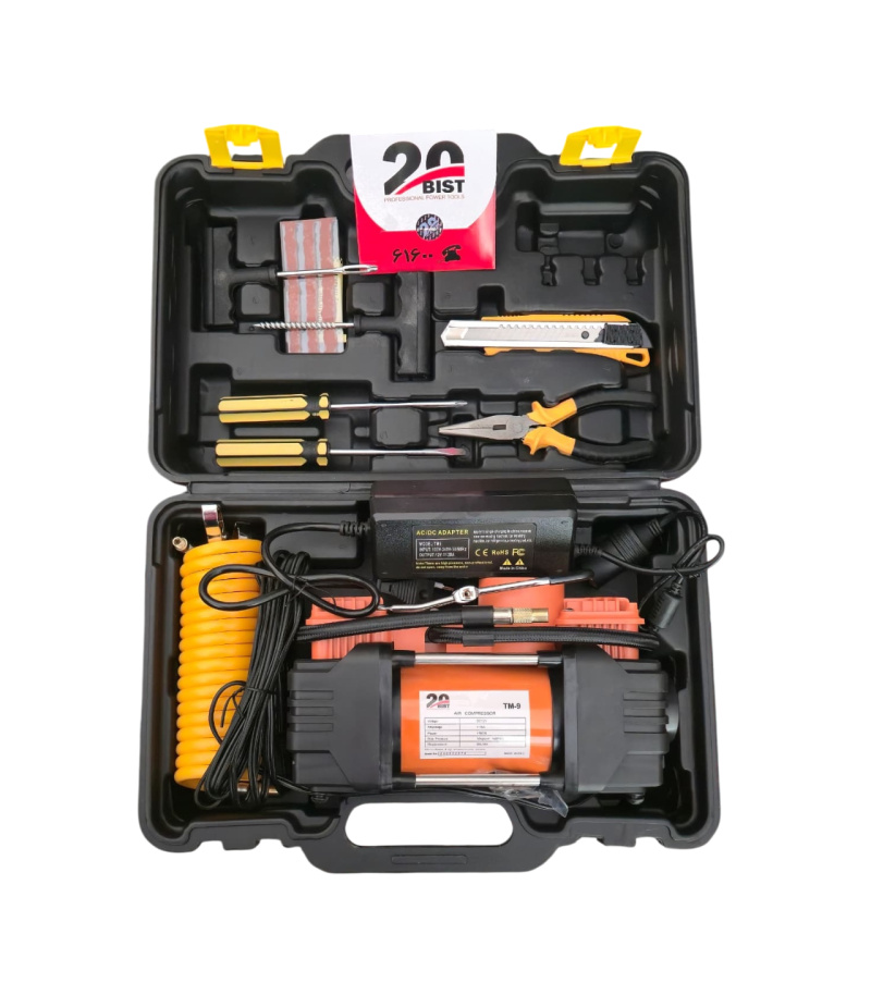 پمپ و کمپرسور باد فندکی 12ولت و 220 ولت حرفه ای دوسیلندر چراغ دار PM با کیف و گارانتی سری 20 کد TM9