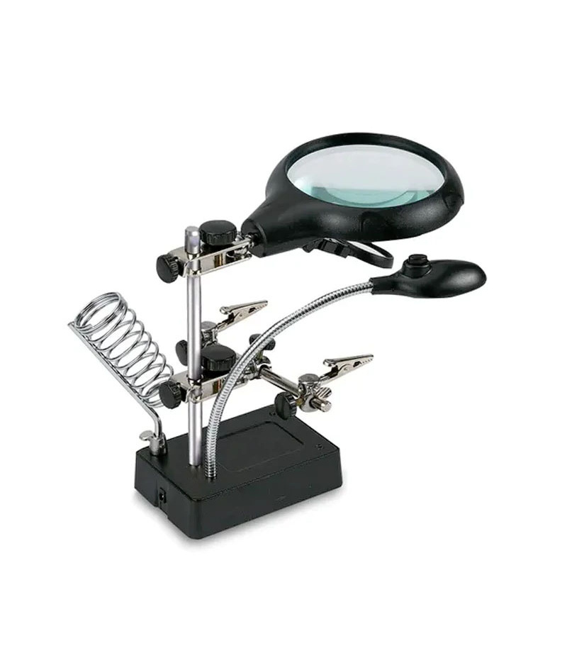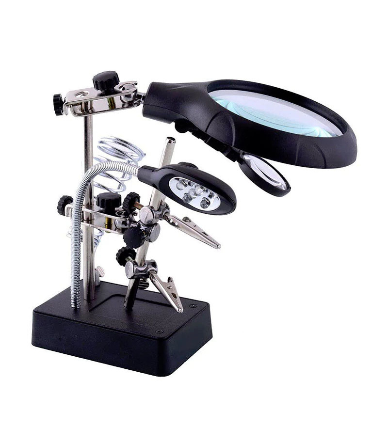 گیره چند منظوره لحیم کاری حرفه ای ذربین دار با منبع نور قابل تنظیم و دارای ذره بین، مناسب برای تعمیر و نگهداری برق، حکاکی، کار دستی و آزمایشگاه و …. دارای چرا LED دارای تنظیم نور حرفه ای که به واسطه باتری و همچنین کابل برق مستقیم می تواند برای شما روشن شود . همینطور این محصول دارای دو گیره سوسماری فوق العاده قوی برای نگهداشتن برد الکترونیکی شما برای لحیم کاری می باشد . ضمن اینکه پایه و بازوی آن کاملاً قابل تنظیم بوده و شما می توانید آنرا به زاویه مورد نیاز خود تنظیم کنید .