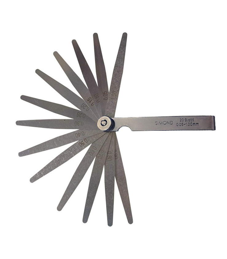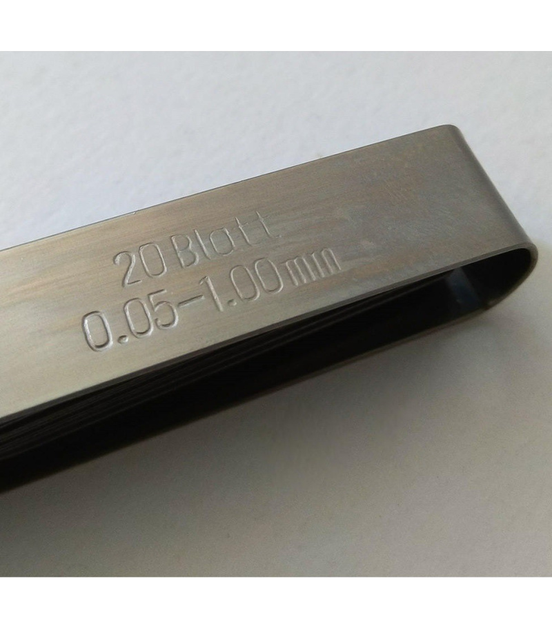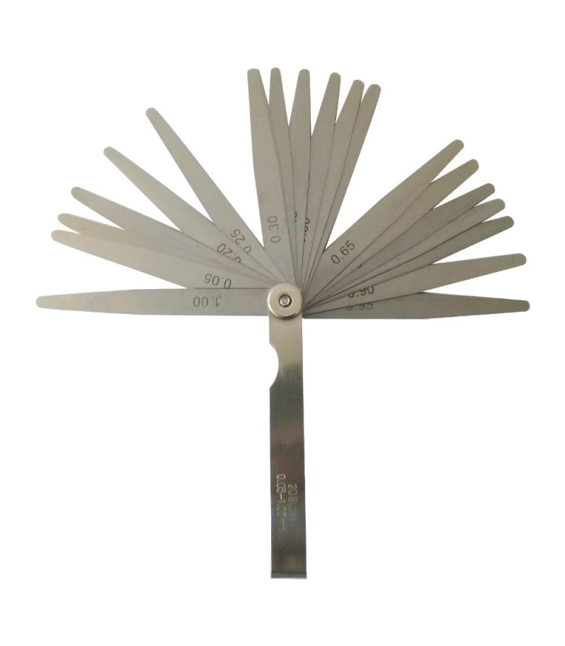 این مجموعه شامل 20 تیغه با ضخامتهای متفاوت از 0.05 تا 1 میلیمتر است که برای تنظیم فواصل مختلف کاربرد دارد. جنس این تیغهها از فولاد است که برای افزایش دوام و جلوگیری از زنگزدگی شرکت سازنده از آبکاری کروم برای آن استفاده کرده است.