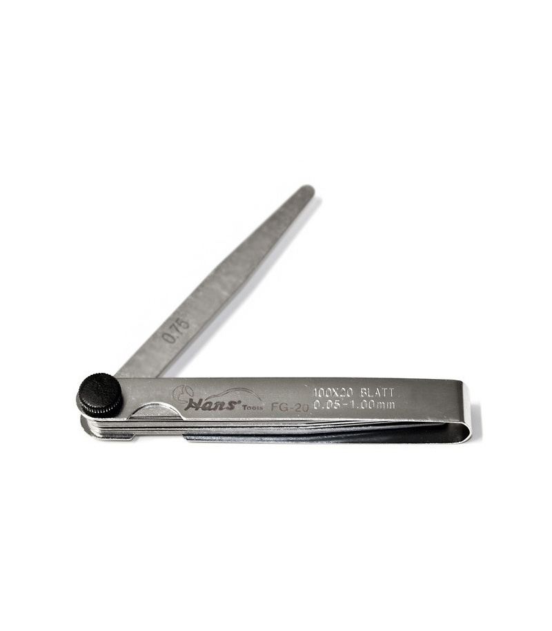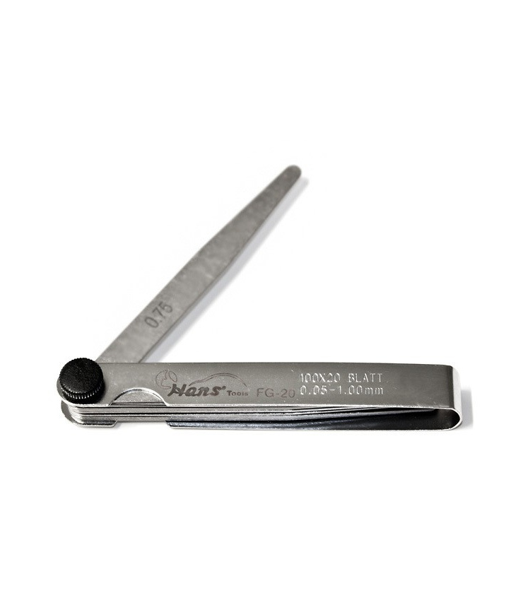 20 عدد تيغه فيلر در سايزهای 0.05، 0.10 0.15، 0.20، 0.25، 0.30، 0.35، 0.40، 0.45، 0.50، 0.55، 060، 0.65، 0.70، 0.75، 0.80، 0.85، 0.90، 0.95 و 1.00 ميلی متر