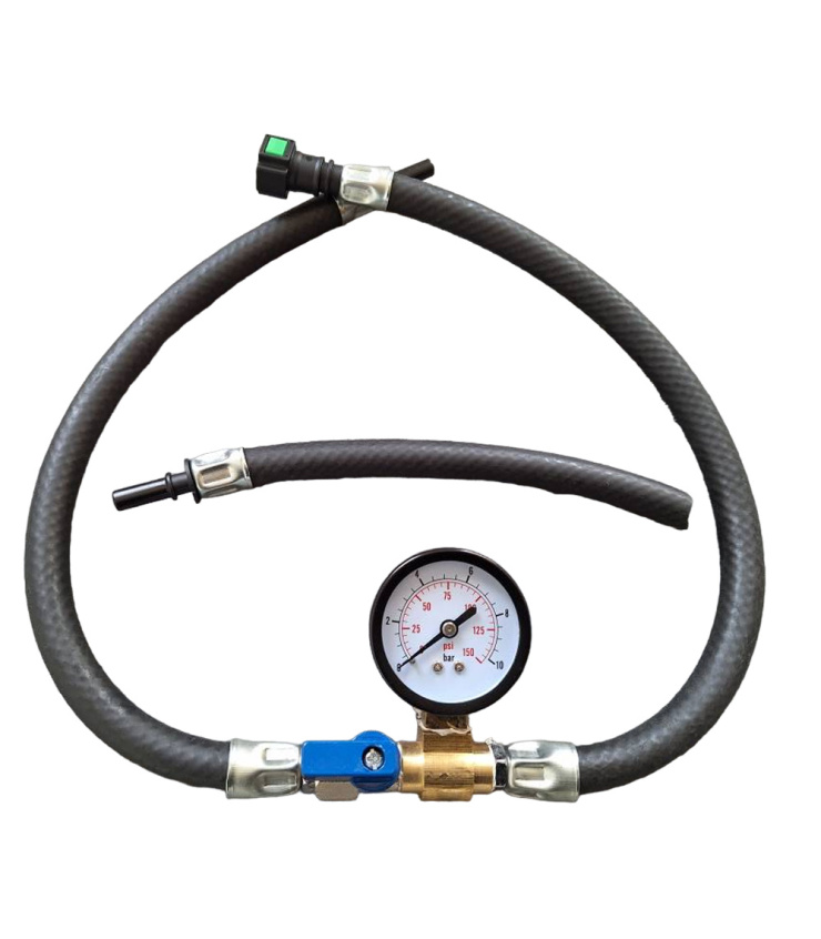 دستگاه فشار سنج پمپ بنزین که به راحتی بر روی ریل سوخت رسانی نصب شده و فشار پمپ بنزین را سنجش میکند.